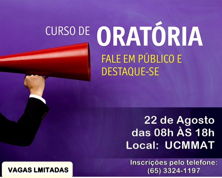 A União das Câmaras Municipais de Mato Grosso (UCMMAT) abre, a partir desta terça-feira (08.08), 40 vagas gratuitas para o curso de oratória e motivação parlamentar. O curso será ministrado no dia 22 de agosto, das 08h às 18 horas, na sede da UCMMAT, em Cuiabá. O tema será voltado totalmente a melhora da conduta e desenvoltura na oratória.
